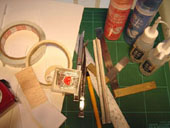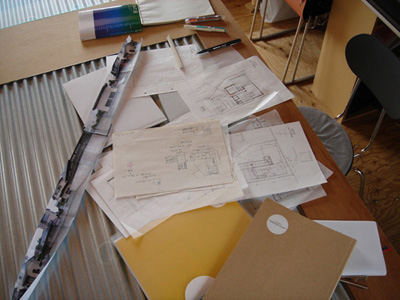 今までのお話、敷地状況をイメージしつつ計画スケッチ 途中、多少煮詰まるも、納得できる案ができる 他の可能性も考え、検証の意味もこめ (ご本人達に選択して頂くという意味もある) 違う性質の案を4つ、ボリュームの異なる模型2つをつくる (建物全体の配置、外への開き方などの構成は土地の性質上同じ) 作業風景&模型材料