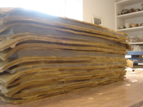 久しぶりの陶芸へ行きました やっぱり、すんごく楽しいのです 作りたいものが次から次へとでてきます でも、まだまだしつこくシマシマ、です 今度のは、以前のより細いライン 「たたら」という板状にした土をこんな風に重ねます 土を水で溶いたものが接着剤 これを、ブロック状にカットしてひたすらくり抜くのです やっぱりなんだかお菓子風。。。