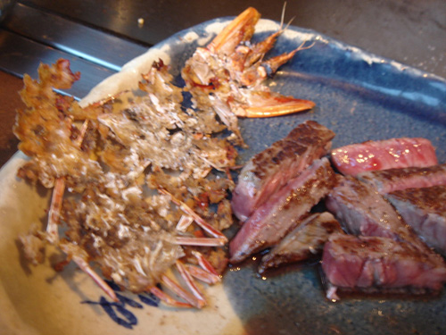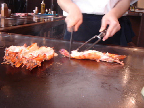 マラソンの後はとってもお肉を欲します 去年のホノルルも ボリュームたっぷりステーキ&シーフード 今回も鉄板焼きにてステーキ&エビさんです 国際通りにある スタッフは女性のみ、という鉄板焼き屋さん 4時半から夕食スタート!! スープ+サラダの後に野菜焼き お肉は、もも肉とサーロインを。 (アグーがなかったのはちと残念) エビさんはせんべいにもなりました 焼きたてのもっちりパンと共に頂きます デザートまで頂いて、満腹。満足。
