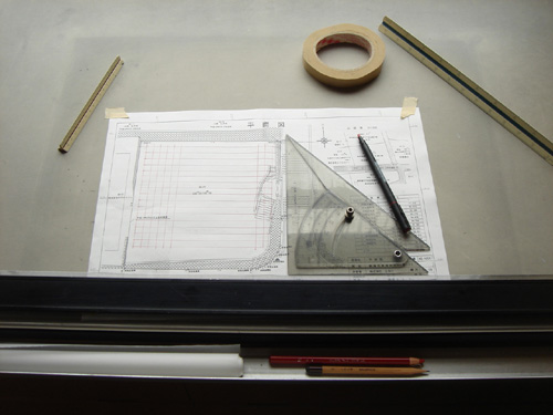 事務所の隅にすっかり置き去られている平行定規で 久しぶりに線を引きました。 といってもグリッドだけですがぁ….。 でもやっぱり手で描く、というのは感じがいいです。 PCでメモ取るのと手書メモでは脳の活性度が違うとTVも言ってたな。 この平行定規は、20歳で初めて勤めた設計事務所で使っていたもの。 7年後、その事務所を退職する時に頂きました。歴史を感じます。