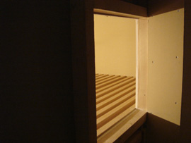約束の時間に現場へ行くと、職人さん達が勢揃い …..まだそんなに打合せ残っていたっけ・・、と少々怯む 建て主さんにも時間を合わせて来て頂いたのに ゆっくりお話しすることが出来なかった(すみません…) 内装の色決め、建具の詳細確認、電気配線のルート確認 大工さんとの細かな納まり確認 全て「図面通りに」と言い切れないところが マンションリフォームの大変なところ ひとつひとつ、現況との摺り合わせをしながら 細かな調整、決定をしていきます 廊下小窓より 子供基地スペースを覗いたところ