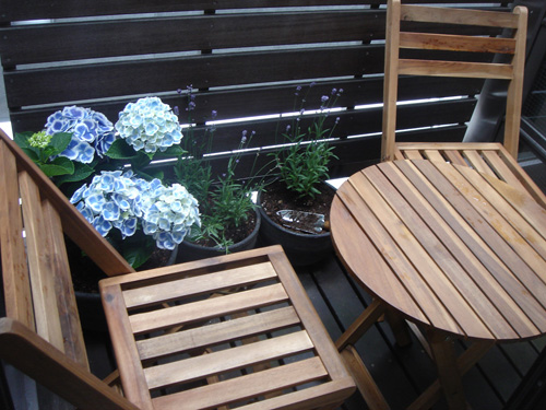 結局、プランターには「あじさい」と「ラベンダー」を 今回はかわいらしく、いろんな色のふわふわフラワーを なーんて思っていたのに…..まあいいことにしましょう (ラベンダーはとてもよい香りで癒されます) 衝動買いのチェアセットを置いたら あまりの狭さにプランターも半分に減らしました(汗) あとは炭を補充すれば準備万端♡ このテーブルで いろんなもの七輪焼きしてビールを頂くのです♡♡ こうなってくると夏も乗り切れそうな気がします(笑) あっ。夏野菜を育てる、という手もあったなー